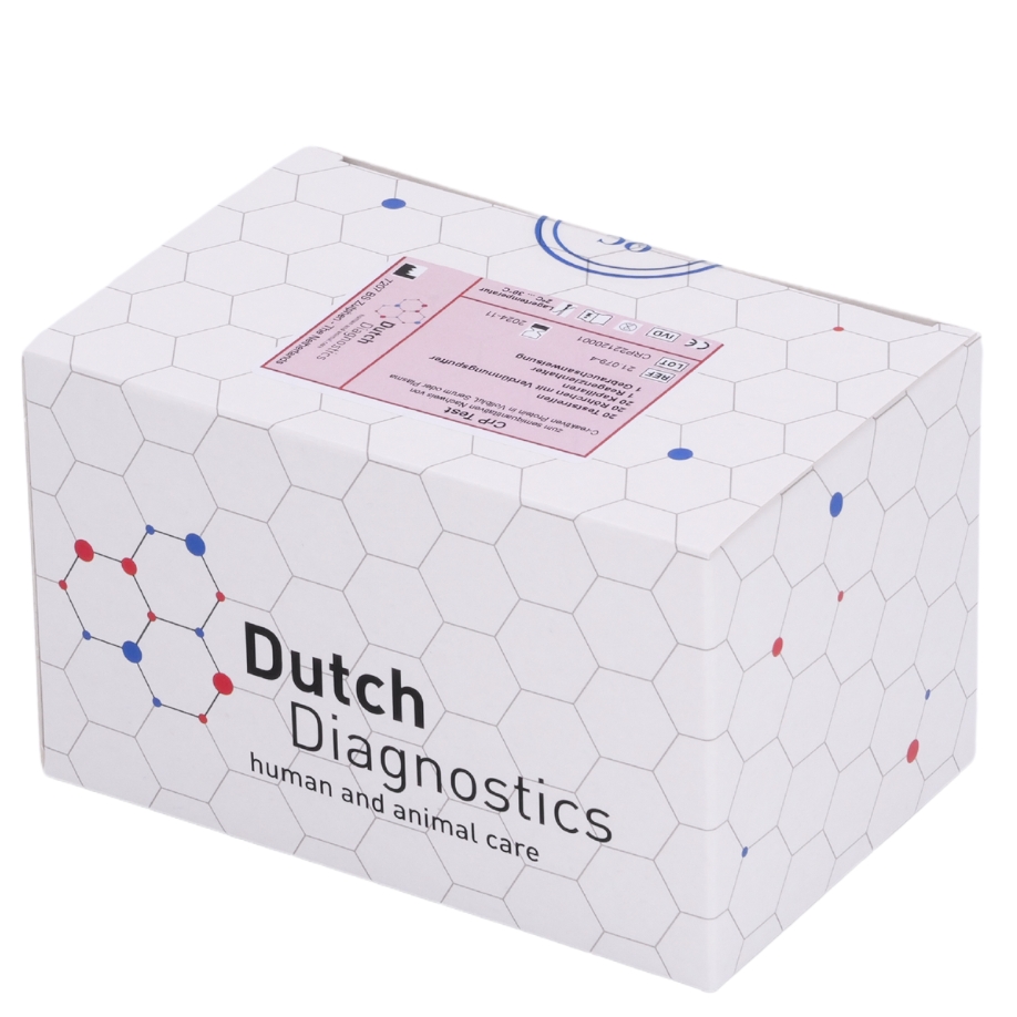 Der CRP Test von Dutch Diagnostics ist ein Schnelltest zum semiquantitativen Nachweis von C-reaktivem Protein in Vollblut, Serum oder Plasma zum in-vitro-diagnostischen Gebrauch durch professionelle Anwender. Dieser Schnelltest ist als Hilfe bei der Diagnose von Entzündungskrankheiten vorgesehen. Der Test hat eine untere Nachweisgrenze von 10 μg/ml.